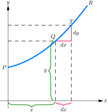 Let \(PQR\), in the next figure, be a portion of a curve plotted with respect to the \(x\) and \(y\) axes. Consider any point \(Q\) on this curve with coordinates \((x,y)\) (i.e. the abscissa of the point is \(x\) and its ordinate is \(y\)).