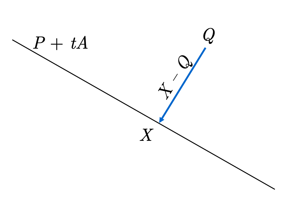 This is a linear equation, which we solve for \(t_{0}\). The desired point is then found by substituting this value for \(t_{0}\) in \(X=P+t_{0} A\). The distance between \(Q\) and the line is simply \(|X-Q|\).