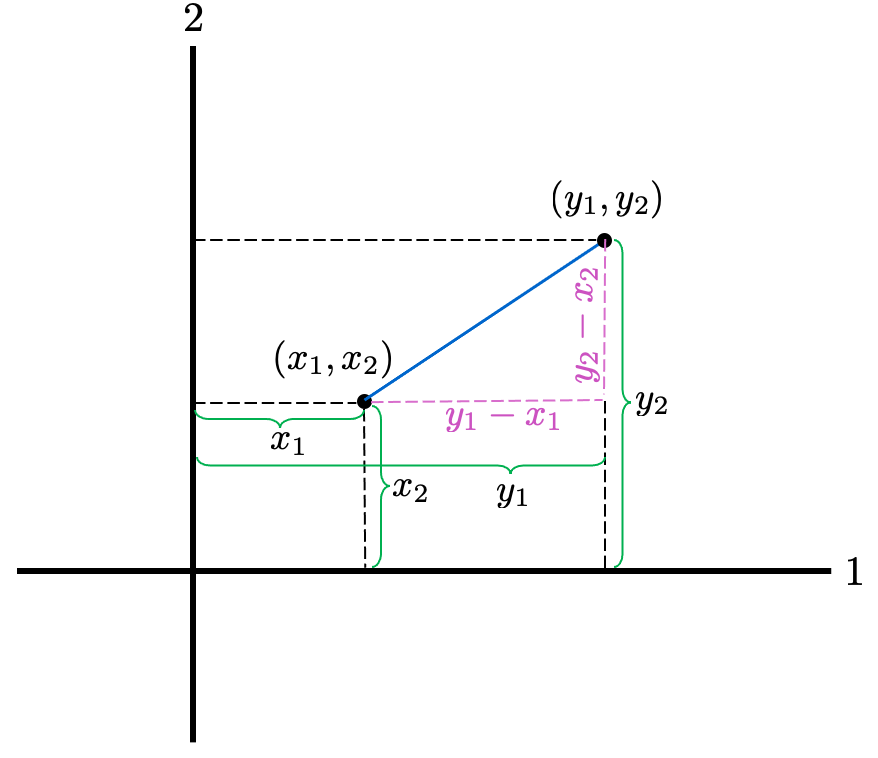 Now we return to two-dimensional space, where the notion of distance is a familiar one. In the figure below, $\left(x_{1}, x_{2}\right)$ and $\left(y_{1}, y_{2}\right)$ are two points in the plane, and the distance between them is the hypotenuse of the triangle with vertices