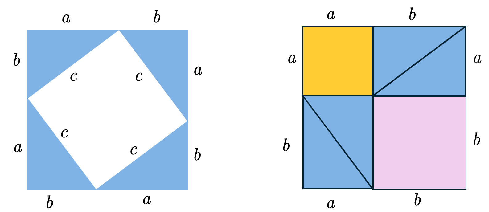 It is of some interest to give a very simple and often unfamiliar proof of the theorem of Pythagoras, as follows: We wish to prove that if $a$ and $b$ are the legs of a right triangle and $c$ is its hypotenuse, then $a^{2}+b^{2}=c^{2}$. Let us form a square of side $a+b$, and decompose it in two ways: