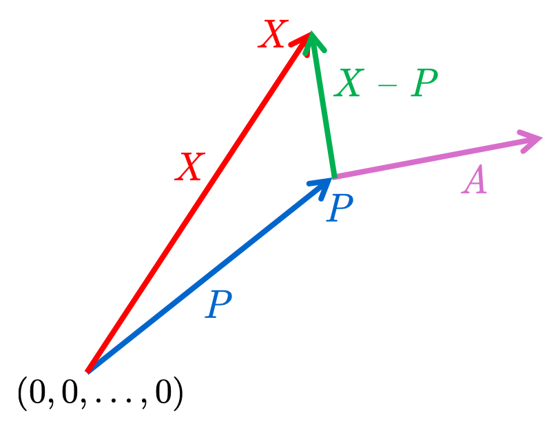 Suppose \(X=\left(x_{1}, x_{2}, \ldots, x_{n}\right)\) is any point on such a plane. Then the line segment joining \(X\) and \(P\) must lie in this plane and therefore must itself be perpendicular to A. Considering this segment as a vector \(X-P\), as indicated in the diagram, we see that \((X-P)\boldsymbol{\cdot} A=0\), or that \[ \boxed{A\boldsymbol{\cdot} X=A \boldsymbol{\cdot} P} \] This is then the desired equation, and the plane is the set of all points \(X=\left(x_{1}, x_{2}, \ldots, x_{n}\right)\) satisfying this relation.