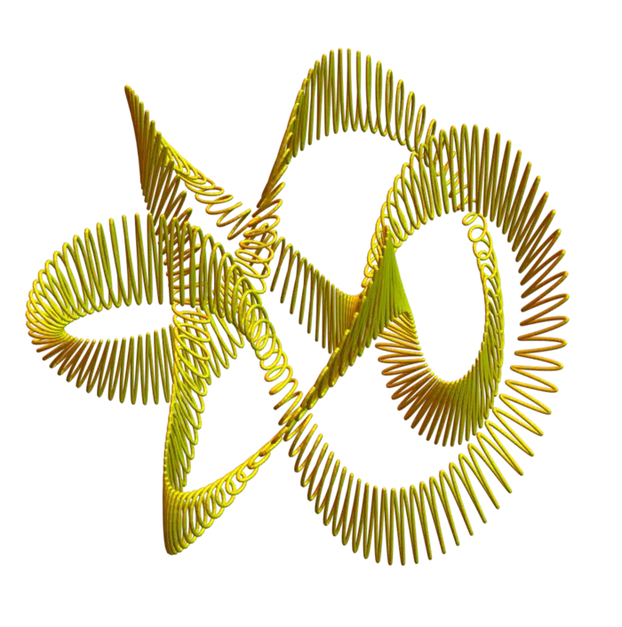 Exercise 3. Compute numerically the arc length of the knot \[r(t)=[\sin (4 t), \sin (3 t), \cos (5 t), \cos (7 t)]\] from \(t=0\) to \(t=2 \pi\). By drawing the first coordinates only and using color as the fourth coordinate, we can see that there are no non-trivial knots in \(\mathbb{R}^{4}\). You can not tie your shoes in \(\mathbb{R}^{4}\)!