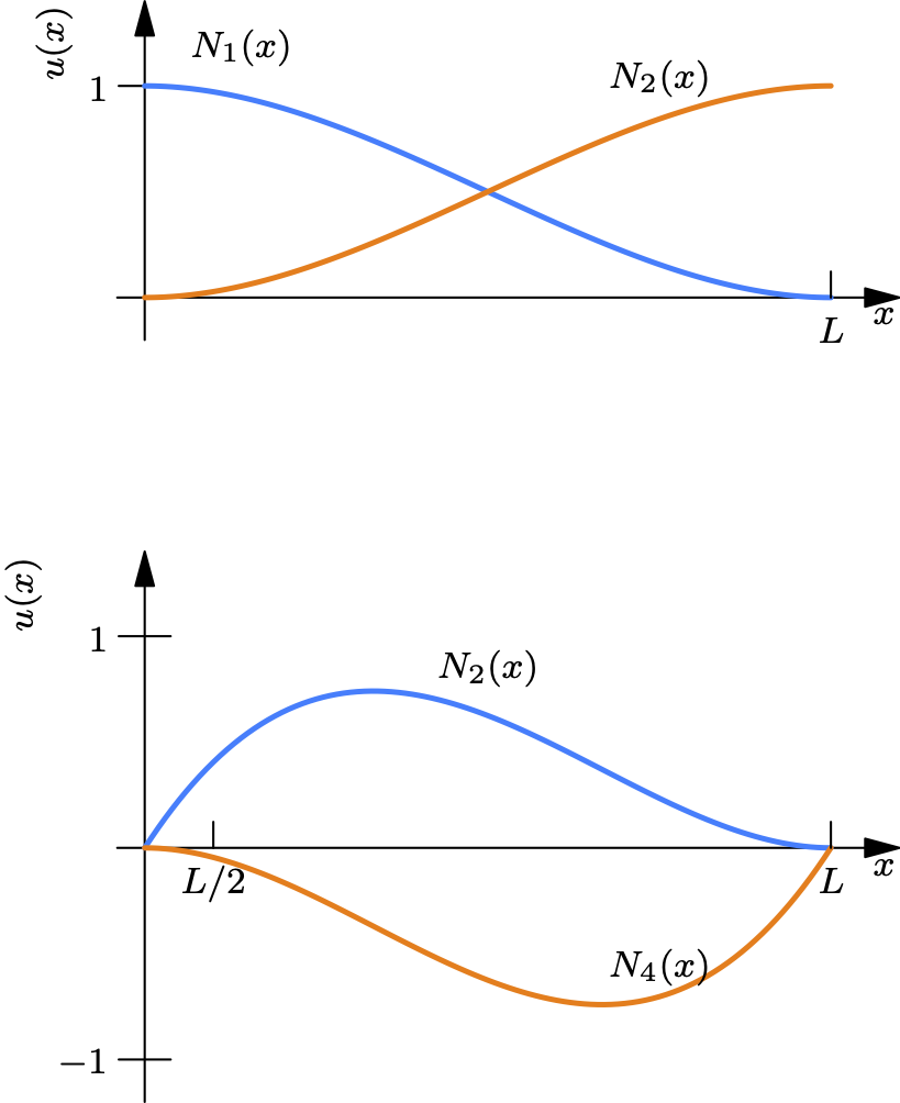 \[ \boxed{ \begin{aligned} N_1(x) &= 1 - \frac{3x^2}{L^2} + \frac{2x^3}{L^3} \\ N_2(x) &= x - \frac{2x^2}{L} + \frac{x^3}{L^2} \\ N_3(x) &= \frac{3x^2}{L^2} - \frac{2x^3}{L^3} \\ N_4(x) &= -\frac{x^2}{L} + \frac{x^3}{L^2} \end{aligned} } \]