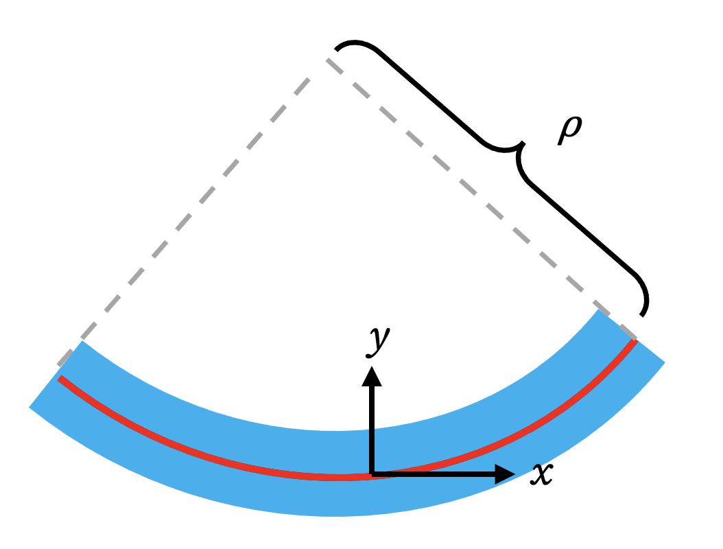For mathematical convenience in structural mechanics, it is common to work with a quantity called curvature, denoted by κ (kappa) (see here). Curvature is simply the reciprocal of the radius of curvature: \[ \kappa = \frac{1}{\rho} \] This means that a gentle bend (large ρ) has a small curvature, while a sharp bend (small ρ) has a large curvature. Using this definition, our strain equation becomes: \[ \epsilon_{xx} = -y \kappa \]