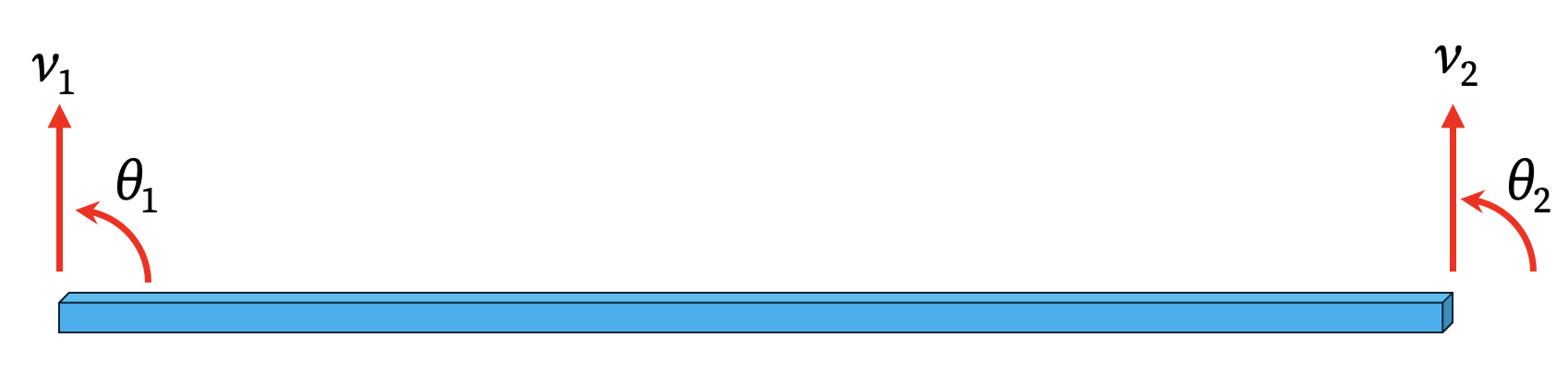To capture bending behavior, we define a two-node beam element. Each node requires two degrees of freedom (DOFs) to describe its state: