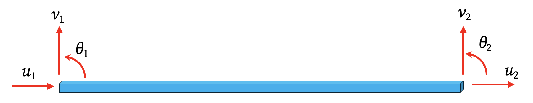 This means a single beam element has a total of four degrees of freedom. These are collected in the element’s generalized nodal displacement vector, q: