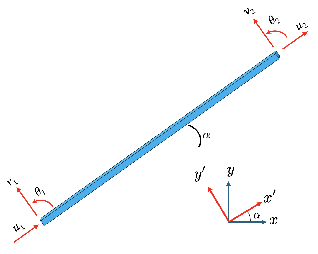\[ \mathbf{T}=\begin{bmatrix} c & s & 0 & 0 & 0 & 0\\ -s & c & 0 & 0 & 0 & 0\\ 0 & 0 & 1 & 0 & 0 & 0\\ 0 & 0 & 0& c & s & 0 \\ 0 & 0 & 0 & -s & c & 0 \\ 0 & 0& 0 & 0 & 0 & 1 \end{bmatrix} \] where \[ c=\cos\alpha,\qquad s=\sin\alpha. \] The stiffness matrix in the global coordinate system becomes \[ \mathbf{K}_e^{\text{global}}=\mathbf{T}^{\mathsf T} \mathbf{K}_e^{\text{local}} \mathbf{T} \]