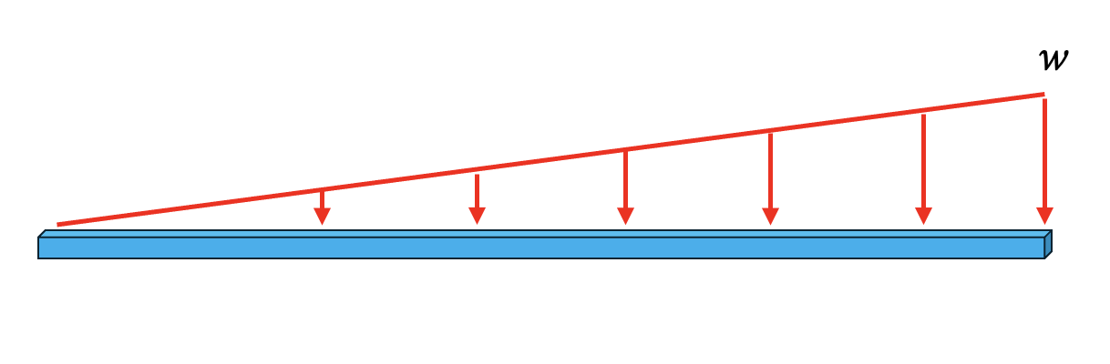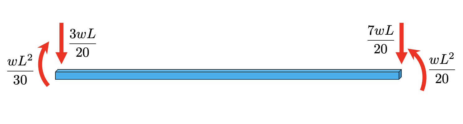 then \[ \bar{t}(x)=-\frac{w}{L}x\] and the equivalent generalized nodal forces are: \[P_1=\int_0^L N_1(x) \bar{t}(x) dx = -\frac{3wL}{20}\] \[M_1=\int_0^L N_2(x) \bar{t}(x) dx = -\frac{wL^2}{30}\] \[P_2=\int_0^L N_3(x) \bar{t}(x) dx = -\frac{7wL}{20}\] \[M_2=\int_0^L N_4(x) \bar{t}(x) dx = \frac{wL^2}{20}\] where \[ \begin{aligned} N_1(x) &= 1 - \frac{3x^2}{L^2} + \frac{2x^3}{L^3} \\ N_2(x) &= x - \frac{2x^2}{L} + \frac{x^3}{L^2} \\ N_3(x) &= \frac{3x^2}{L^2} - \frac{2x^3}{L^3} \\ N_4(x) &= -\frac{x^2}{L} + \frac{x^3}{L^2} \end{aligned} \]