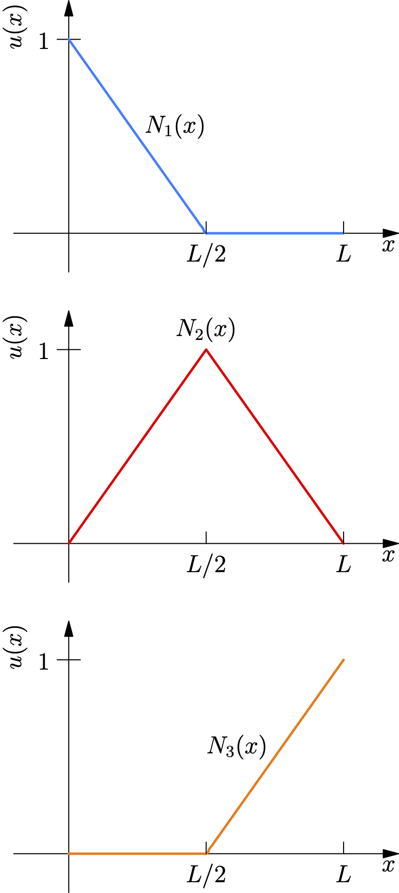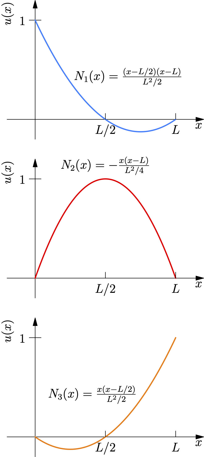 For a 3-node bar element (nodes at x=0, L, L/2), the displacement field is: \[ u(x) =\begin{bmatrix}N_1(x) & N_2(x) & N_3(x)\end{bmatrix}\begin{bmatrix}q_1 \\ q_2 \\ q_3\end{bmatrix}\] where N₁, N₂, N₃ are quadratic functions: \[ N_1^{(2)}(x)=\frac{(x-L/2)(x-L)}{L^2/2}, \] \[ N_2^{(2)}(x)=-\frac{x(x-L)}{L^2/4}, \] \[ N_3^{(2)}(x)=\frac{x(x-L/2)}{L^2/2}. \]