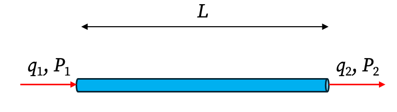 The equilibrium of the forces requires that \(P_1=-P_2\). From the strength of materials we know \[ \frac{P_1}{A}=E\frac{q_1-q_2}{L}, \qquad \frac{P_2}{A}=E\frac{q_2-q_1}{L}, \] The above equations can be written as \[ P_1=\frac{EA}{L}(q_1-q_2),P_2=\frac{EA}{L}(q_2-q_1) \]