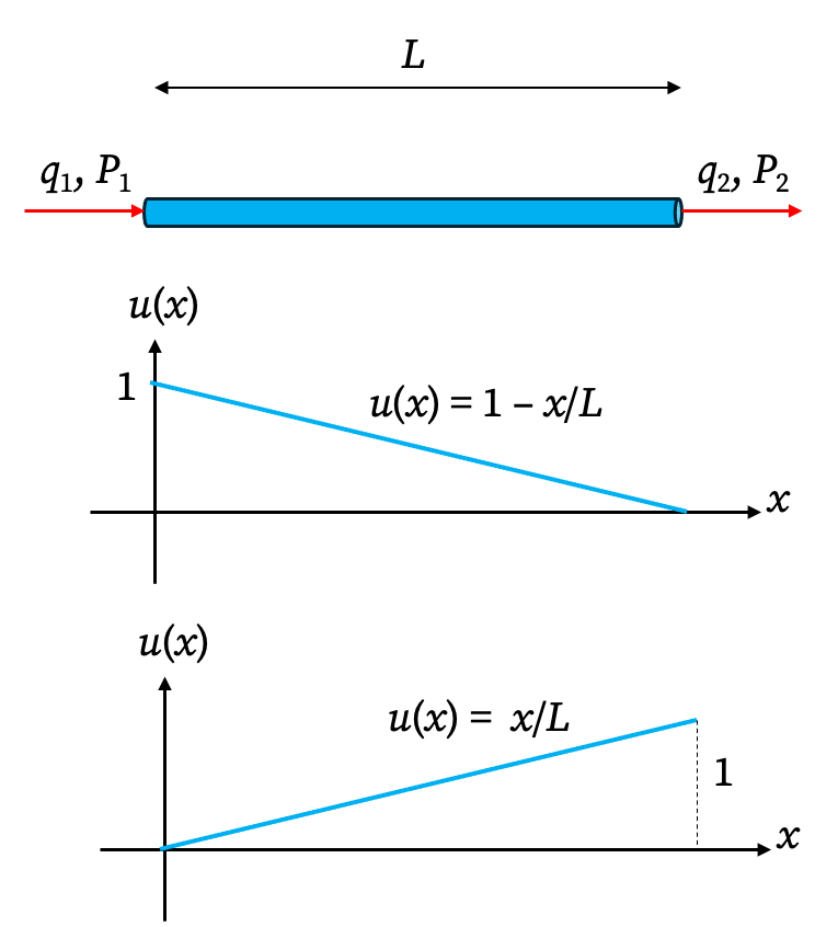 Using supperposition, we get \[ u(x) = \left(1 - \frac{x}{L}\right)q_1 + \left(\frac{x}{L}\right)q_2 = \mathbf{H}(x) \begin{bmatrix} q_1\\ q_2 \end{bmatrix} \] where \[\mathbf{H}=\begin{bmatrix} 1-\dfrac{x}{L} & \dfrac{x}{L}\end{bmatrix}\] is the shape function matrix.