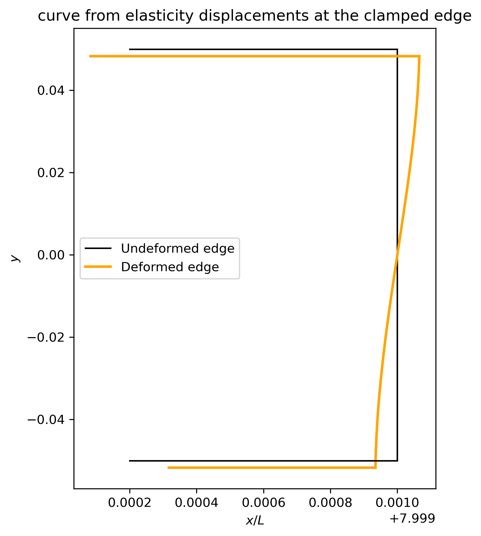 A key insight from the elasticity solution is that cross-sectional planes, initially flat and perpendicular to the neutral axis, do not remain planar after deformation when shear stresses are present. This behavior contrasts with the assumption of the Euler–Bernoulli beam theory, which presumes that “plane sections remain plane.” The figure below illustrates the resulting distortion of the end cross-section.