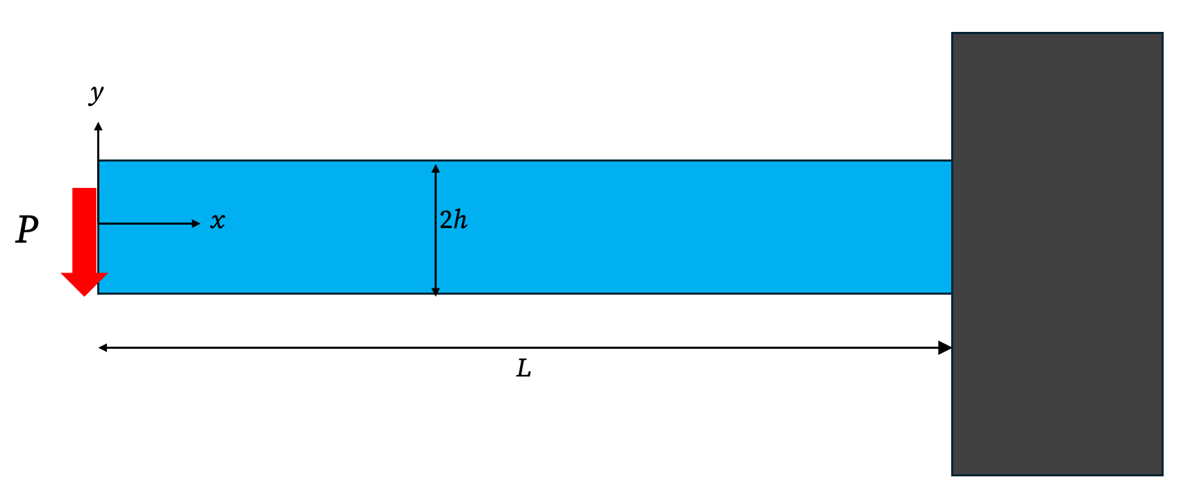 Consider a straight rectangular beam of length \(L\), height \(h\), and width \(b\). The beam is fixed at the end \(x=0\) and is free at the end \(x=L\). A concentrated vertical force, \(P\), acts downwards at the free end.