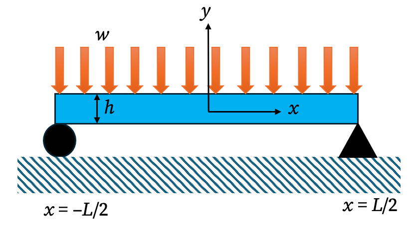 Consider a simply supported beam of length \(L\), height \(h\), and width \(b\). The beam is under a uniform transverse loading of intensity (force per unit length) \(w\). The intensity of the force (force per unit area) is \(q=\dfrac{w}{b}\).