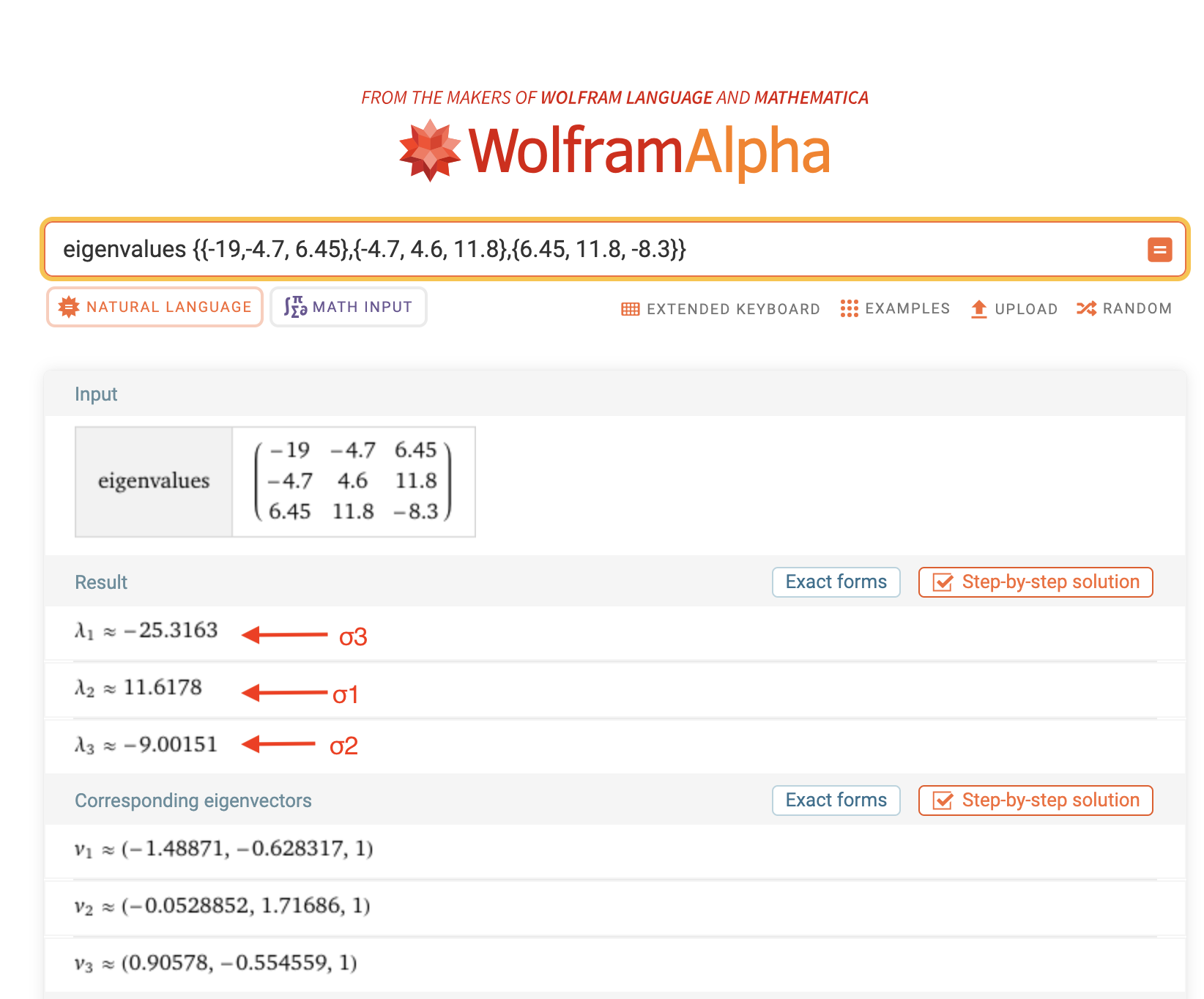 Instead of forming the characteristic equation (12): \[ \sigma_n^3-I_1 \sigma_n^2-I_2\sigma_n-I_3=0 \] and attempting to solve it (for example, numerically), we can make use of mathematical software packages such as NumPy, MATLAB, Mathematica, or Wolfram Alpha. These tools are capable of find eigenvalues (principal stresses) and eigenvectors (principal directions) of a square matrix.