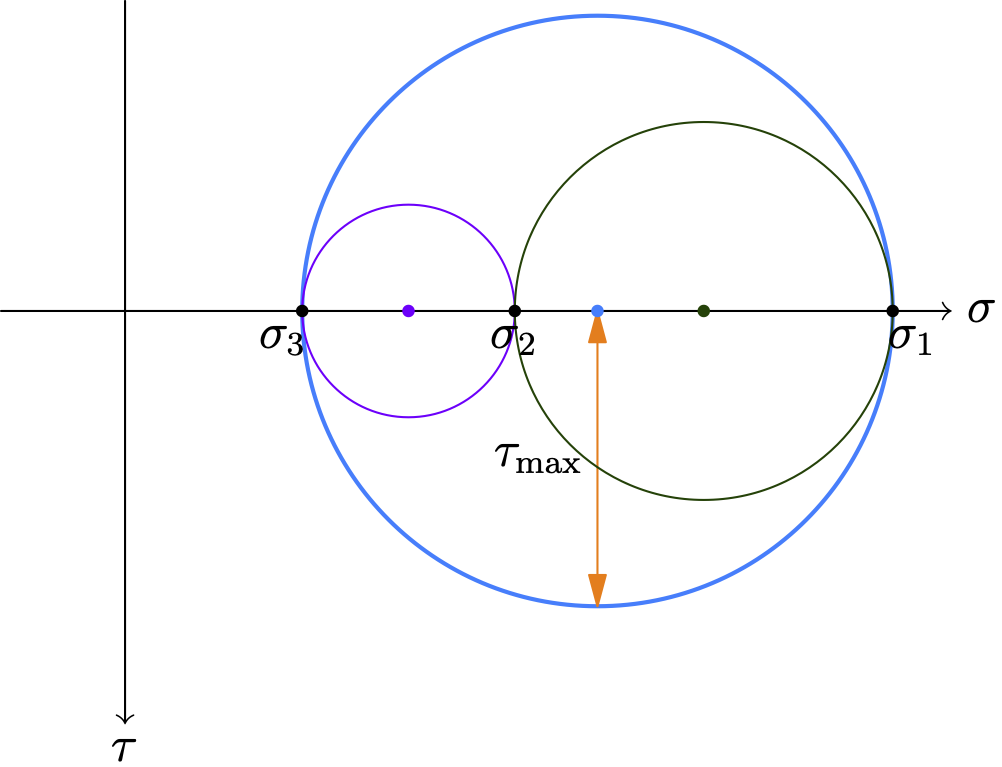 The largest of these circles is the one generated by rotating around the intermediate principal direction (direction 2), as it spans between the maximum and minimum principal stresses (see the following figure).