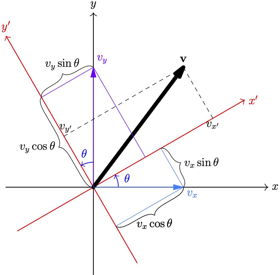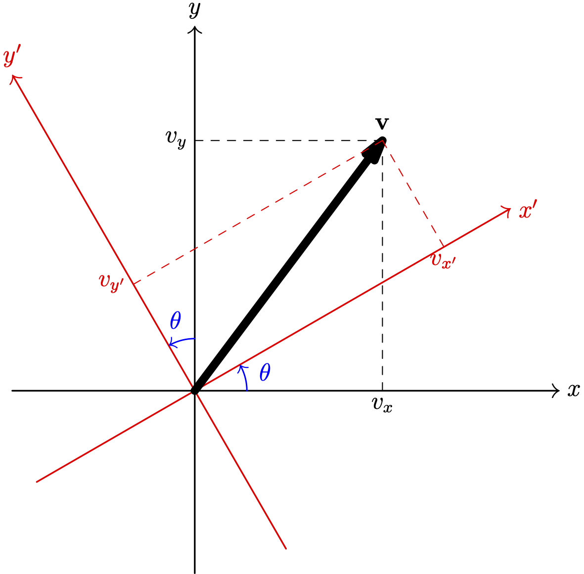 Suppose that we have rotated the coordinate system by an angle \(\theta\). Let’s call the new coordinate system x’y’. We want to see how the components of a vector in a new system can be obtained from its components. That is, if the components of a vector \(\mathbf{v}\) be \(v_x\) and \(v_y\) in the old system and \(v_{x'}\) and \(v_{y'}\) in the new system (see the following figure), we want to express \(v_{x'}\) and \(v_{y'}\) in terms of \(v_x\) and \(v_y\) .