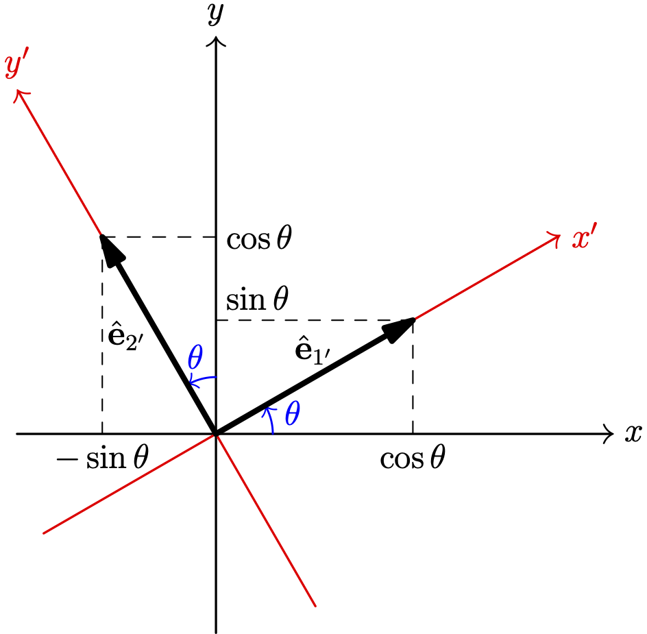 Let’s start with \[ \hat{\mathbf{e}}_1 = l_{11'} \hat{\mathbf{e}}_{1'} + l_{12'} \hat{\mathbf{e}}_{2'}. \] find the dot product of both sides by \(\hat{\mathbf{e}}_1\) \[ \begin{aligned} \hat{\mathbf{e}}_1 \cdot \hat{\mathbf{e}}_{1'}&= l_{11'} \underbrace{\hat{\mathbf{e}}_{1'} \cdot \hat{\mathbf{e}}_{1'}}_{1}+ l_{12'} \underbrace{\hat{\mathbf{e}}_{2'}\cdot \hat{\mathbf{e}}_{1'}}_0\\ &= l_{11'} \end{aligned} \] But the dot product of a two unit vector is equal to the cosine of the angle between them (which is the same as the cosine of the angle between x and x’). Also we notice that \(l_{11'}\) is the first component of \(\hat{\mathbf{e}}_{1'}\) in the old system \[ \hat{\mathbf{e}}_1 \cdot \hat{\mathbf{e}}_{1'} = l_{11'} = \cos(x, x') = \cos \theta = (\hat{\mathbf{e}}_1')_1 \] Similarly, we can show that \[ \hat{\mathbf{e}}_1 \cdot \hat{\mathbf{e}}_{2'} = l_{12'} = \cos(x, y') = \cos\!\left(\theta + \tfrac{\pi}{2}\right) = -\sin \theta = (\hat{\mathbf{e}}_{2'})_1 \] That is \(l_{12'}\) is the first component of \(\hat{\mathbf{e}}_{2'}\) in the old coordinate system. Similarly \[ \hat{\mathbf{e}}_2 \cdot \hat{\mathbf{e}}_1 = l_{21}' = \cos(y_1, x_1') = \cos\!\left(\theta - \tfrac{\pi}{2}\right) = \sin \theta = (\hat{\mathbf{e}}_1')_2 \] \[ \hat{\mathbf{e}}_2 \cdot \hat{\mathbf{e}}_2 = l_{22}' = \cos(y_1, y_1') = \cos \theta = (\hat{\mathbf{e}}_2')_2 \] Therefore, \[ \begin{bmatrix} l_{11'} & l_{12'} \\ l_{21'} & l_{22'} \end{bmatrix}=\begin{bmatrix} (\hat{\mathbf{e}}_{1'})_1 & (\hat{\mathbf{e}}_{2'})_1\\ (\hat{\mathbf{e}}_{1'})_2 & (\hat{\mathbf{e}}_{2'})_2 \end{bmatrix} \tag{9} \] That is, the columns of the above matrix are the unit vectors along the new coordinate system in the old coordinate system.