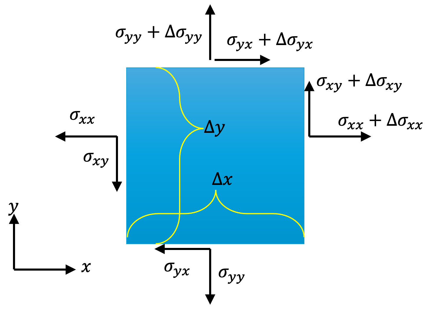The components of stress that contribute to \(M_z\) are the shear stresses in the \(xy\)-plane. Body forces do not contribute to the moment. Thus, the total moment can be expressed as \[ \begin{aligned} M_z=&\left( \sigma_{x y}+\Delta \sigma_{x y}\right)(\Delta y \Delta z) \frac{\Delta x}{2}+\sigma_{x y}(\Delta y \Delta z) \frac{\Delta x}{2}\\ &-\left(\sigma_{y x}+\Delta\sigma_{y x}\right)(\Delta x \Delta z) \frac{\Delta y}{2}-\sigma_{y x}(\Delta x \Delta x) \frac{\Delta y}{2} \end{aligned} \] Equating this with the inertia expression, we obtain \[ \begin{aligned} &\frac{1}{12}\rho \Delta x \Delta y \Delta z [(\Delta x)^2+(\Delta y)^2]=\\ &\left( \sigma_{x y}+\Delta \sigma_{x y}\right)(\Delta y \Delta z) \frac{\Delta x}{2}+\sigma_{x y}(\Delta y \Delta z) \frac{\Delta x}{2}\\ &-\left(\sigma_{y x}+\Delta\sigma_{y x}\right)(\Delta x \Delta z) \frac{\Delta y}{2}-\sigma_{y x}(\Delta x \Delta x) \frac{\Delta y}{2} \end{aligned} \] Neglecting higher-order small terms, we get \[ 0=\sigma_{xy}\Delta x\Delta y\Delta z -\sigma_{yx}\Delta x\Delta y\Delta z, \] which leads to
