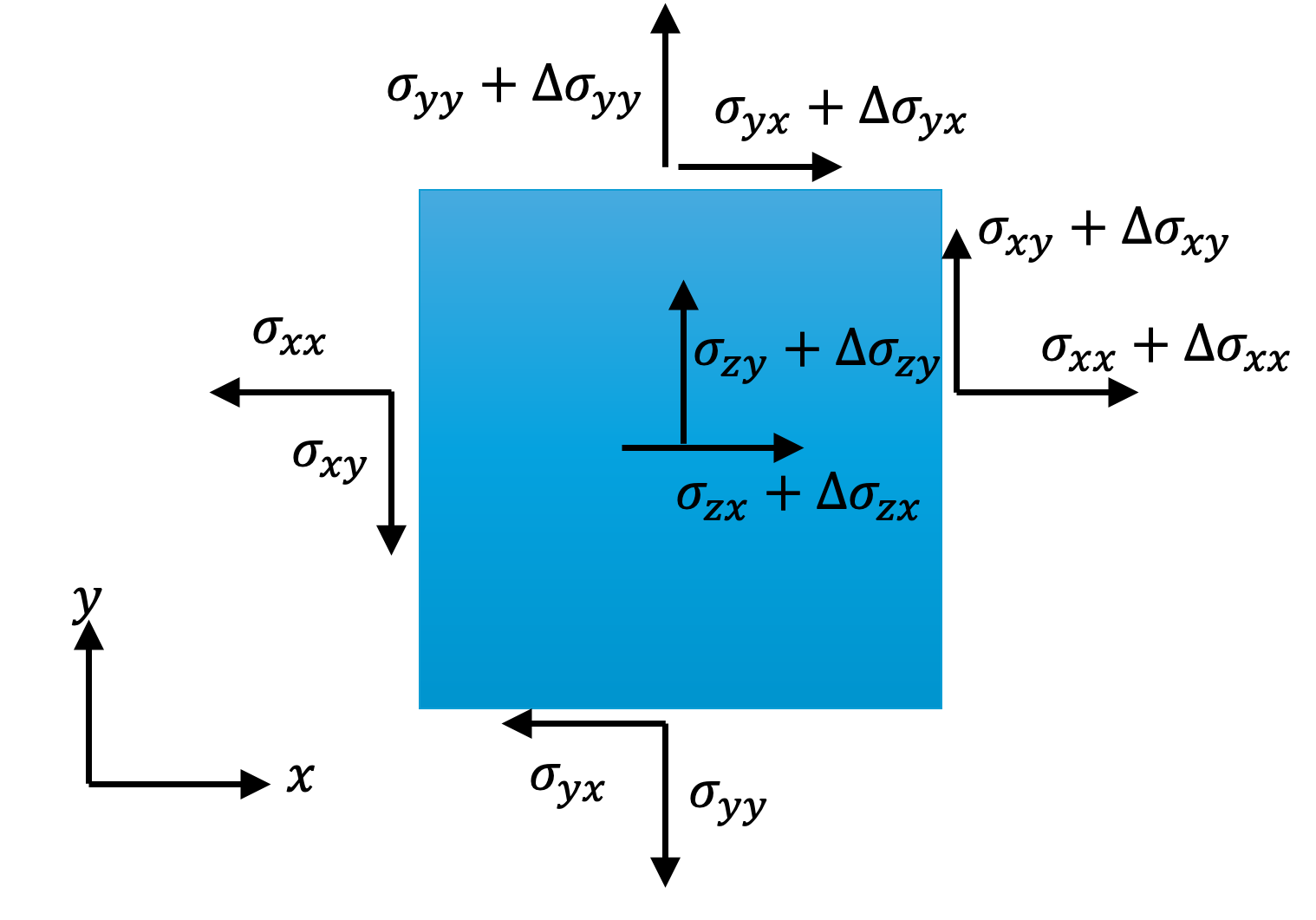 Consider an element with dimensions \(\Delta x\), \(\Delta y\), and \(\Delta z\). Stress components act on each face of this element. On each face of this cuboidal element, the stress components may differ from those on the opposite face. For example, if the xx-component of stress on one face is \(\sigma_{xx}\), then on the opposite face it will be taken as \(\sigma_{xx}+\Delta \sigma_{xx}\).