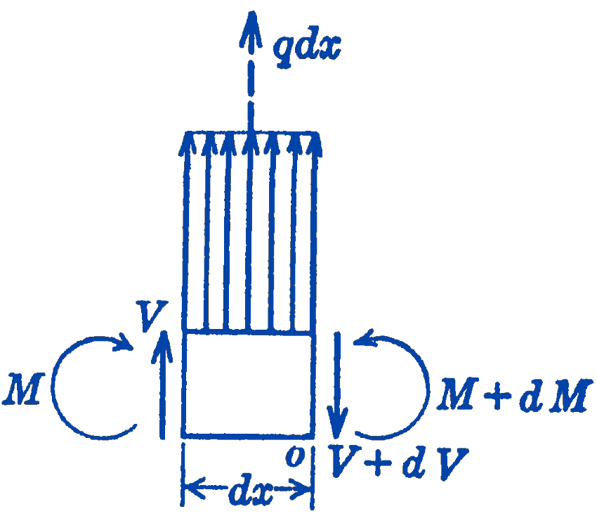 For equilibrium, we have: \[ \begin{aligned} & \sum F_{y}=0=V+q\, d x-(V+d V) \\ & \sum M_{o}=0=M+d M-M-V\, d x-(q\, d x)\left(\frac{d x}{2}\right) \end{aligned} \] From the first equation: \[ \bbox [5px,border:1px #f2f2f2;background-color:#f2f2f2]{q=\frac{d V}{d x}} \] And from the second equation, neglecting the second-order differential \((d x)(d x)\) : \[ \bbox [5px,border:1px #f2f2f2;background-color:#f2f2f2]{V=\frac{d M}{d x}} \]