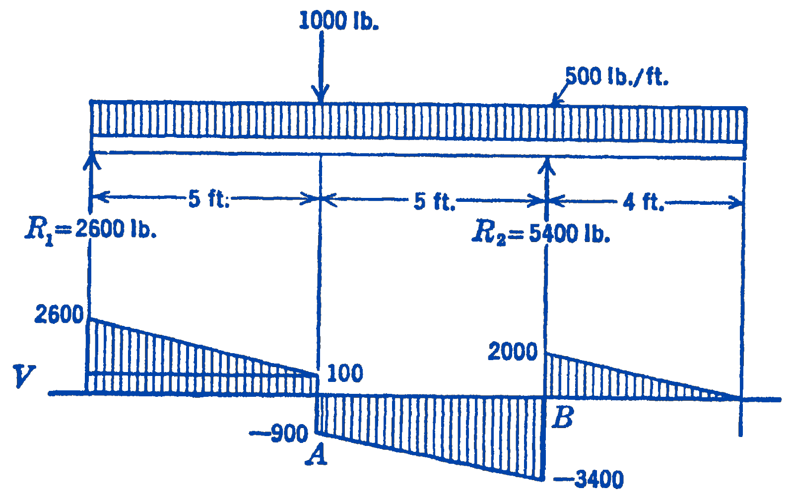 Solution. We first determine the reactions and plot the shearing force diagram by the previously described method. The relationship \(q=\dfrac{d V}{d x}\) tells us that where the load is uniformly distributed the slope of the shear force diagram is constant, and that where a concentrated load occurs there will be a discontinuity in the shear force diagram.