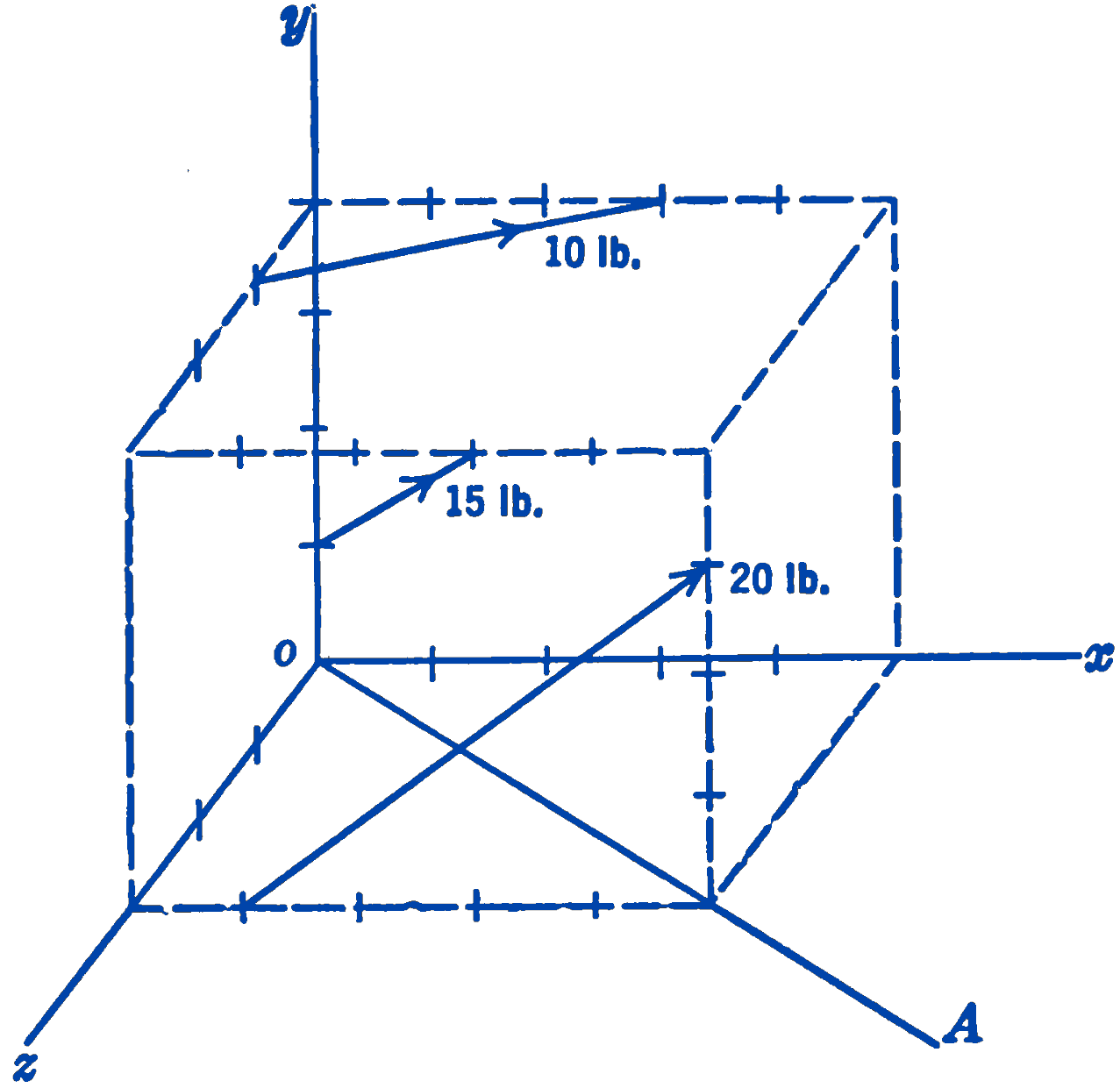 4. Find the moment of the three forces shown in the figure about the axis \(OA\). Do this by first finding the components of the moments along the three coordinate axes, and then by adding the components of these components along the line \(OA\).