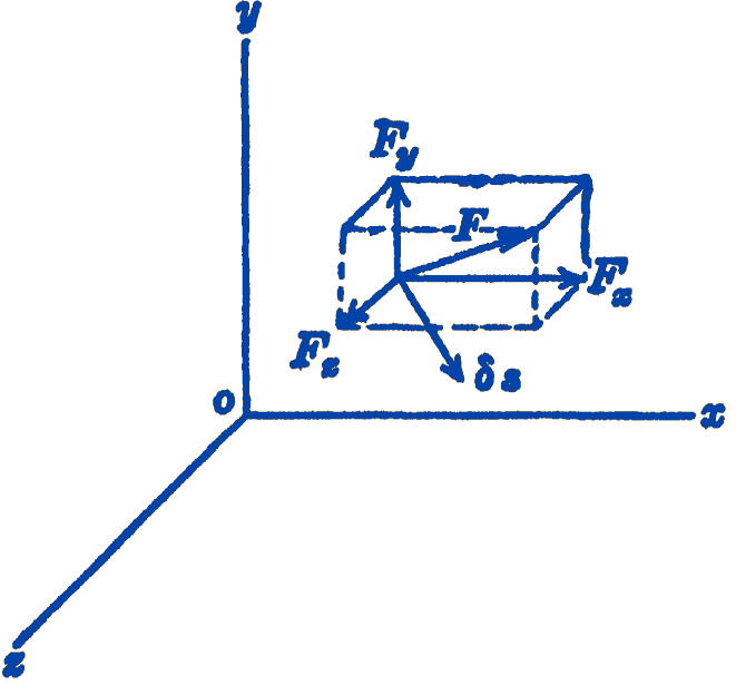 Consider a particle which is free to move in any direction, and which is held in equilibrium by some general system of forces whose resultant is zero. In Fig. 1 one of the forces of the system, \(\mathbf{F}\), is shown, along with its three rectangular components.