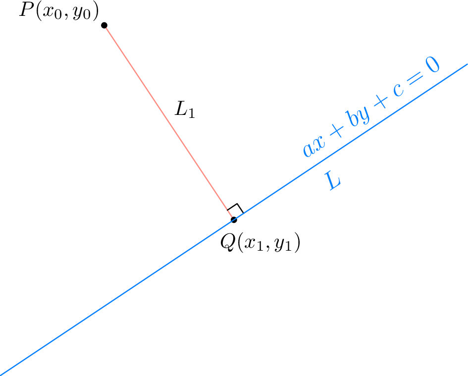 Drop a perpendicular \(L_1\) from \(P\) to \(L\) and call the foot of the perpendicular \(Q\left(x_{1}, y_{1}\right)\) . Because the slope of \(L\) is \(-\frac{a}{b}\) , the slope of \(L_1\) is \(\frac{b}{a}\) . Since \(P\left(x_{0}, y_{0}\right)\) lies on \(L_1\) , the equation of \(L_1\) is \[y-y_{0}=\frac{b}{a}\left(x-x_{0}\right)\]