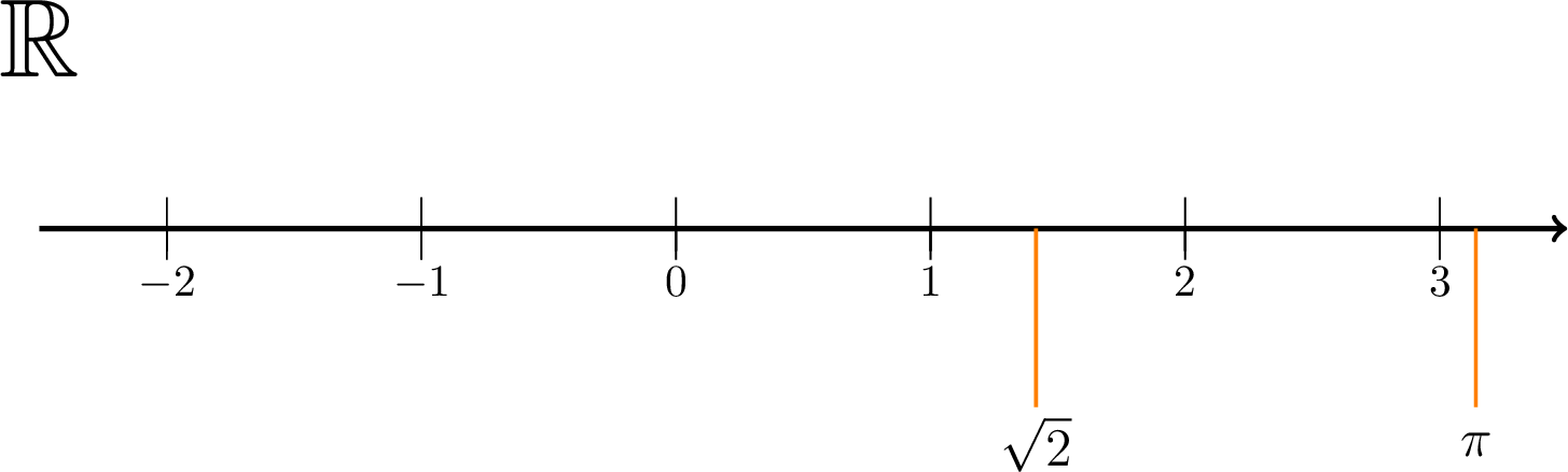 The ancient Greeks knew that the lengths of some lines in simple figures cannot be expressed as the ratio of integers. For example, from the Pythagorean theorem they knew that the diagonal of a square with sides of unit length is \(\sqrt{2}\) , but \(\sqrt{2}\) cannot be written in the form of \(p/q\) where \(p\) and \(q\) are integers. Another well-known example that cannot be expressed as the ratio of two integers is \(\pi=3.141592\ldots.\) Such numbers are called irrational numbers . The decimal digit representation of an irrational number goes on forever and never repeats. The set of all rational and irrational numbers is called the set of real numbers and is denoted by \(\mathbb{R}\) .