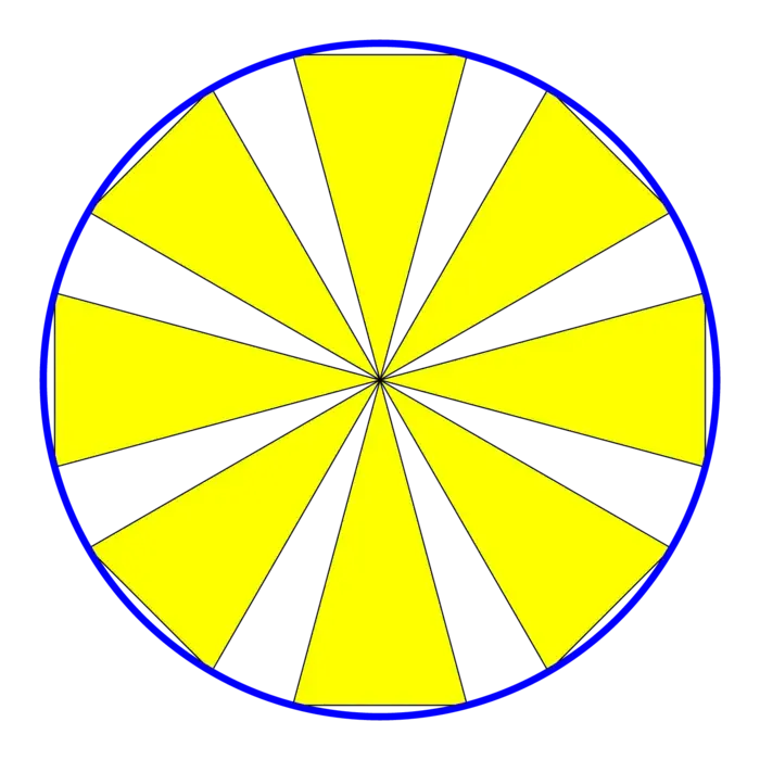 Archimedes: also this needed some time. It emerged pretty early that the circumference is somehow proportional to the radius. The measurement of the constant was then a bit trickier even so it remained open what fraction it is. \(22/7\) was close. I got first the diameter/area ratio. I did that using the following picture.