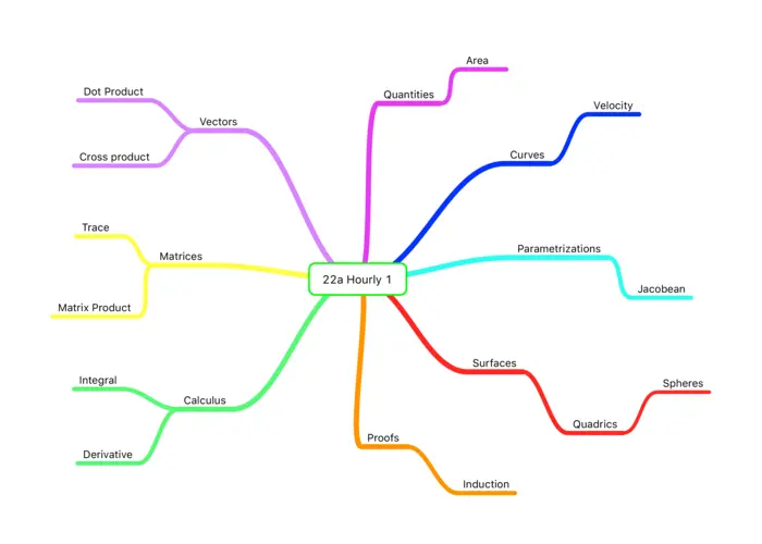 In a bit more than a week we have to start thinking about our first midterm, let us organize the knowledge accumulated so far. We can do that in various ways. One technique is a mind map. It allows on one picture to organize a vast amount of content and see connections which might otherwise be missed. In Figure (12.2) we started to build such a mind map. There are lots of branches still missing, even main ones. One could start also with one entry like "matrix", put it in the center then build connections to other objects definitions or results.