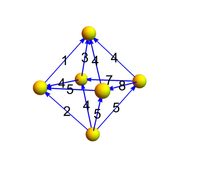 Exercise 2. Figure (33.5) shows a vector field on the octahedron a two dimensional discrete sphere. Determine all the curls and check that the sum of all curls is zero. You have checked \(\int_{S} \operatorname{curl}(F) \,d S=0\) for a closed surface.