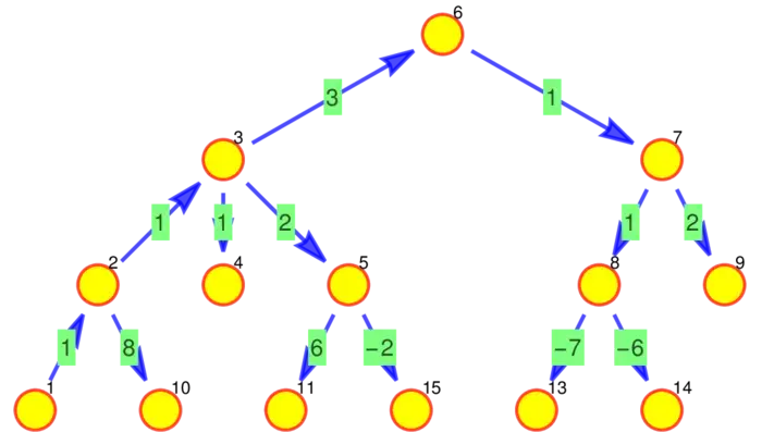 Exercise 3. Figure (33.6) shows a tree, a graph without closed loops. Find a potential function \(f\). You can assume that the value at the top node is \(0\). You see then that the function value right below is \(1\). Get all the function values of the potential.