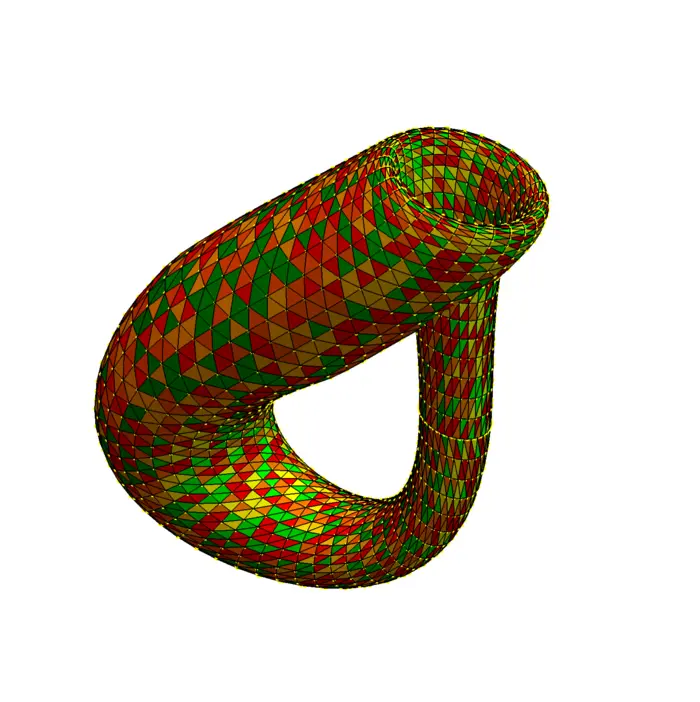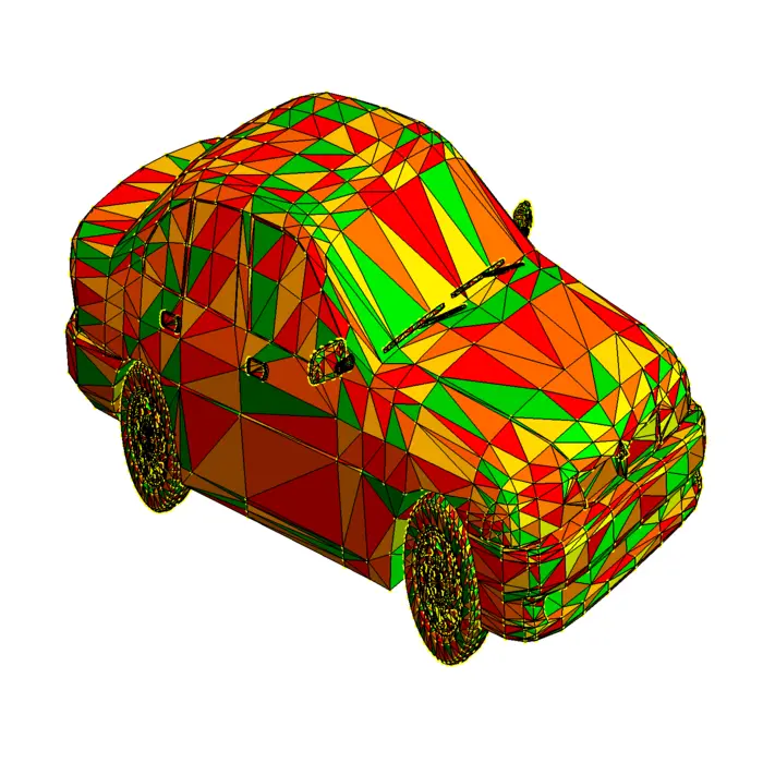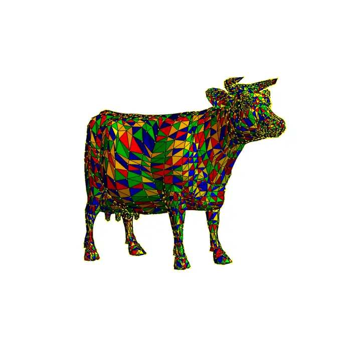 Example 6. A computer can determine the volume of a solid enclosed by a triangulated surface by computing the flux of the vector field \(F=[0,0, z]\) through the surface. The vector field has divergence \(1\) so that by the divergence theorem, the flux gives the volume. A computer stores a geometric object using triangles. Assume \(A B C\) is that triangle. If \(n=A B \times A C\) points outside the region, then the flux is \(F \cdot n / 2\). A computer can now add up all these values and get the volume.
