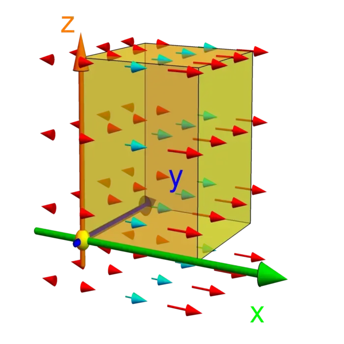 The fastest way to compute the volume of a complicated solid is to use Gauss theorem. It turns out that the flux of the vector field \(F=[x, 0, 0]\) through the boundary surface \(S\) of a solid \(E\) is the volume. Gauss theorem equates this flux with the creation of the field inside. If you draw out the vector field \(F=[x, 0, 0]\) you see that it expands things out. Look at the unit cube. The field does not flow through the \(y=0\), \(y=1\) or \(z=0\) and \(z=1\) faces because the field is parallel there. On \(x=0\), the field is zero. The only face of the cuboid where some field passes is \(x=1\) and the field is leaving there. So, something must be created inside. This creation of field is called divergence. If \(F=[P, Q, R]\), then \(\operatorname{div}(F)=P_{x}+Q_{y}+R_{z}\). In the case \(F=[x, 0, 0]\) we have constant divergence \(1\). We have seen that \[\iint_{E} \operatorname{div}(F) \,d V=\iint_{S} F \cdot d S.\] You can also see that for fields like \(F=[0, x, 0]\) the total flux is zero as what comes in on one side goes out on the other side. Any linear linear field \(F\) as a linear combination of fields in the class \[\begin{aligned} &[x, 0,0], \quad [y, 0,0], \quad [z, 0,0],\\ &[0, x, 0], \quad [0, y, 0], \quad [0, z, 0],\\ &[0,0, x], \quad [0,0, y], \quad [0,0, z] \end{aligned}\] for which the divergence theorem is satisfied.