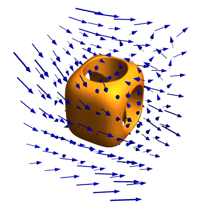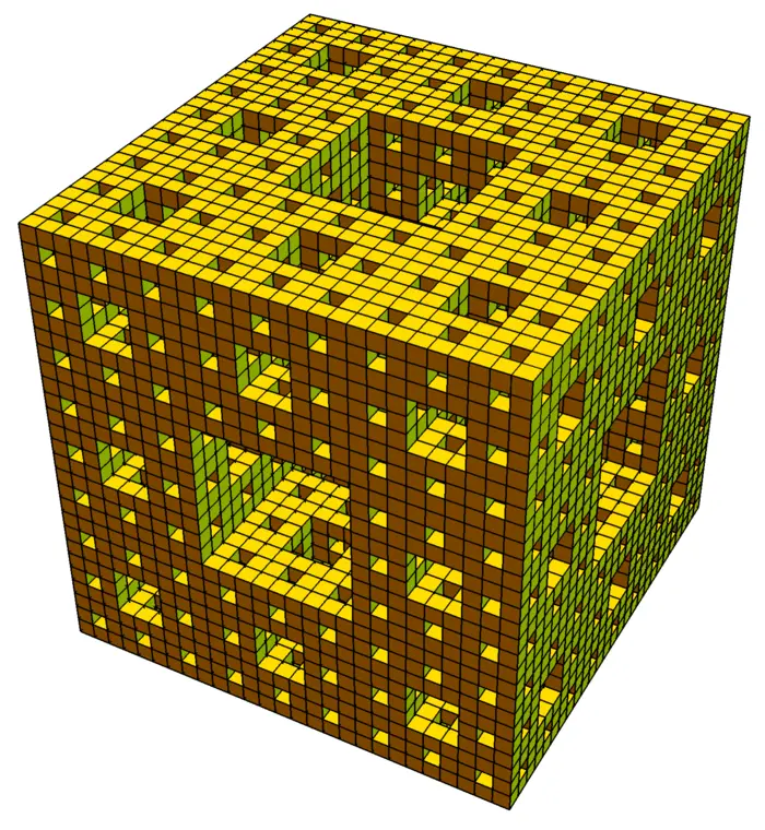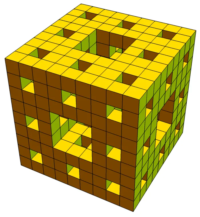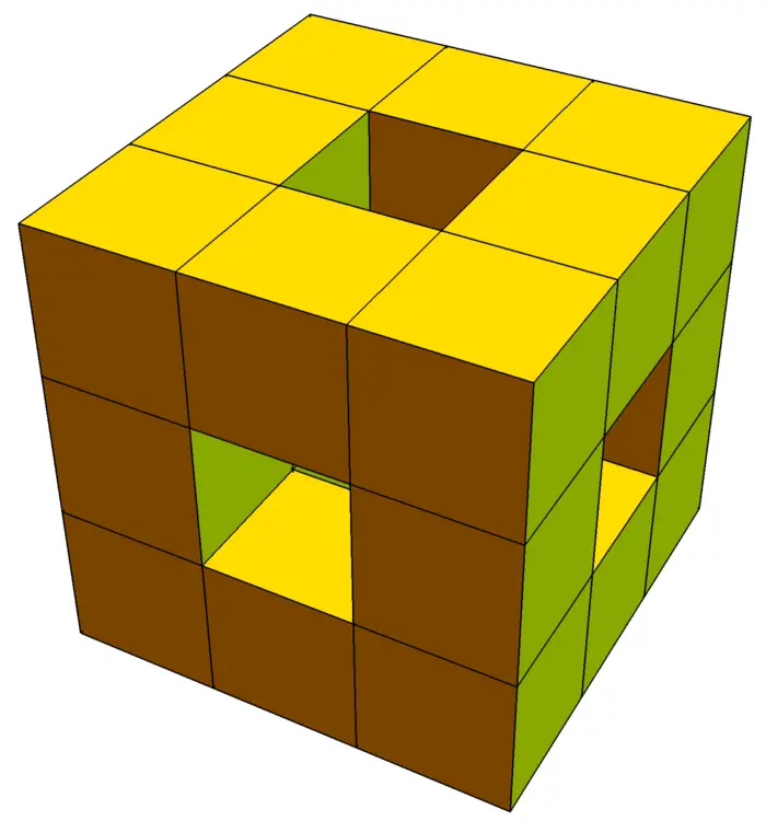 Example 2. Problem: What is the flux of the vector field \[F(x, y, z)=\big[6 x+y^{3}, 3 z^{2}+8 y, 22 z+\sin (x)\big]\] through the solid \[G=[0,3] \times[0,3] \times[0,3] \setminus \big([0,3] \times[1,2] \times[1,2] \cup [1,2] \times[0,3] \times[1,2] \cup [0,3] \times[0,3] \times[1,2]\big)\] which is a cube with three perpendicular cubic holes which is the first stage of the Menger sponge construction?