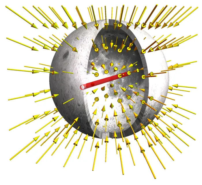 Solution: A direct computation of summing up all the field values \[F(x)=\iint_{G}(x-y) /|x-y|^{3} \,d y\] is difficult as we can not compute in spherical coordinates. Fortunately we have the divergence theorem. The field \(F(x)\) has constant length \(F(\rho)=|F(x)|\) for \(x\) on a sphere \(S(\rho)\) of radius \(\rho\) and points inwards. So \[\iint_{S(\rho)} F \cdot d S=-4 \pi \rho^{2} F(\rho).\] Gauss was able to write down the gravitational field as a partial differential equation , where \(\sigma(x)\) is the mass density of the solid. We see then with the divergence theorem that \(\iiint_{B(\rho)} 4 \pi \sigma(x) \,d x\) is equal to \(-4 \pi \rho^{2} F(\rho)\). Assuming \(\sigma\) to be constant, we have \[4 \pi(4 \pi \rho^{3} / 3) \sigma=-4 \pi \rho^{2} F(\rho)\] which gives \(F(\rho)=(4 \sigma / 3) \rho\). The field grows linearly inside the body. If \(\rho\) is bigger than the radius of the moon, then \(\iiint_{B(\rho)} 4 \pi \sigma(x) \,d x\) is \(4 \pi M\), where \(M=\iiint_{G} \sigma(x) \,d x\) is the mass of the moon. We see that in that case \(F(\rho)=M / \rho^{2}\), which is the Newton law.