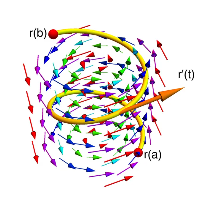 Example 2. If \(F=E\) is an electric field, then the line integral \(\int_{a}^{b} E(r(t)) \cdot r^{\prime}(t) \,d t\) is an electric potential. In celestial mechanics, if \(F\) is the gravitational field, then \(\int_{a}^{b} F(r(t)) \cdot r^{\prime}(t) \,d t\) is a gravitational potential difference. If \(f(x, y, z)\) is a temperature and \(r(t)\) the path of a fly in the room, then \(f(r(t))\) is the temperature, which the fly experiences at the point \(r(t)\) at time \(t\). The change of temperature for the fly is \(\frac{d}{d t} f(r(t))\). The line-integral of the temperature gradient \(\nabla f\) along the path of the fly coincides with the temperature difference.