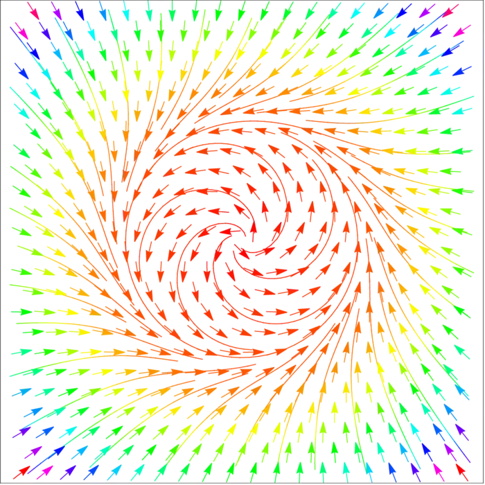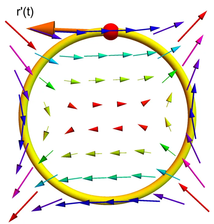 One of the questions we want to answer is under which conditions a general vector field \(F\) is a gradient field \(F=\nabla f\). The reason is that if this is the case, then the integral \(\int_{a}^{b} F(r(t) \cdot r^{\prime}(t) \,d t\) is easy to evaluate. If \(F\) is a gradient field, the result is \(f(r(b))-f(r(a))\). In general however, vector fields are not gradient fields. In the above figure we see an example. Not all hope is lost however. We will learn in the next two weeks that in some cases, like of the path is closed, we have other ways to compute the line integral.