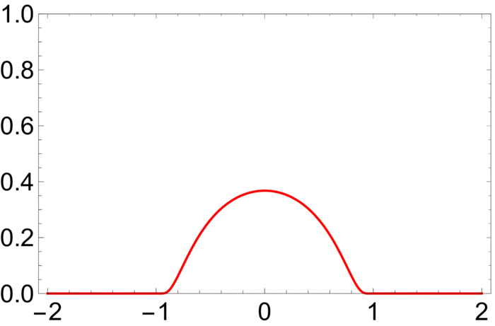 Exercise 2. The function \(f\) defined by \(f(x)=e^{-1 / x}\) for \(x>0\) and \(0\) for \(x \leq 0\) is smooth and that all derivatives at \(0\) are zero. Check \(f^{\prime}(0), f^{\prime \prime}(0), f^{\prime \prime \prime}(0)=0\). Conclude that there are smooth functions for which the Taylor expansion does not work. Check then that is \(b(x)=\) \(f(r^{2}-|x|^{2})\) a "bump function" (see figure 18.3). First define what a "bump function" is.