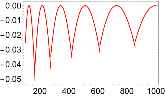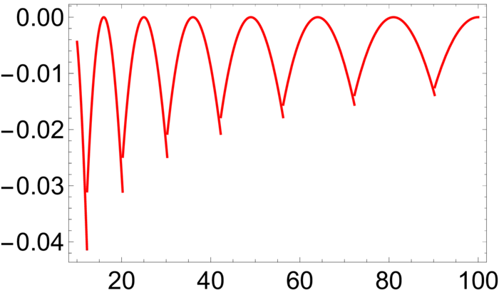 Why is this remarkable? It shows that computing the numbers \(f(n)\) could be done nicely using calculus by defining a function \(f\). Using Taylor’s theorem we can compute the entries \(g(n)\). The Goldbach conjecture is equivalent to \[\begin{aligned} g^{2 n}(0) \text { is nonzero for all } n \geq 1. \end{aligned}\] The only thing we would really need is to get a grip on the function \(f\). Unfortunately, nobody has seen how to write down the function \(f\) in terms of known functions. But it is not completely hopeless that there should not exist a modification \[f(x)=\sum_{p \text { prime }} a_{p} x^{p}\] with positive \(a_{p}\) such that \(f(x)\) is expressible using known functions. Also then, if \(g(x)=f(x)^{2}\) had positive even derivatives, Goldbach would follow.