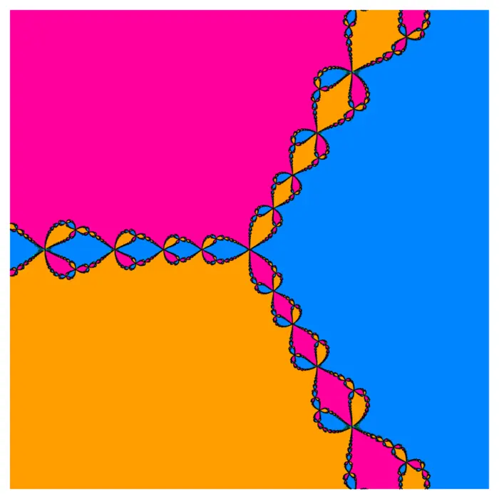 There is an interesting story here when applying the Newton method in the complex plane. The function \(f(x)=x^{3}-9\) has exactly \(3\) roots in the complex plane. They are \(9^{1 / 3}\), \(9^{1 / 3} e^{i 2 \pi / 3}\) and \(9^{1 / 3} e^{i 4 \pi / 3}\). Check that these three numbers satisfy \(f(x)=0\)! Investigating the Newton method in the complex actually predated the Mandelbrot story. One can wonder what happens if you apply the Newton method with a given initial condition. The solution will end up in one of the three roots, but which ones? When drawing this, we see the Newton fractal. here is how you can plot the Newton fractal.1