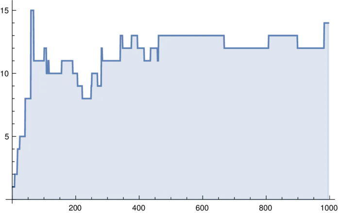 ListPlot[Table[GraphDiameter[Babylonian[n]],n,1000]] gives the diameter of the largest component \(B_{1}(n)\) of \(B(n)\). We have \(\operatorname{Diam}\left(B_{1}(5000)\right)=18, \operatorname{Diam}\left(B_{1}(10000)\right)=29\).EXERCISES