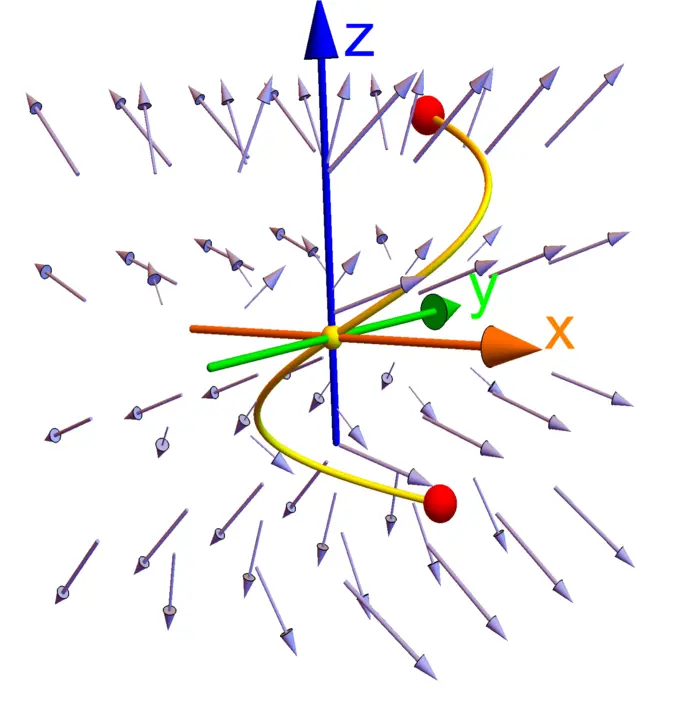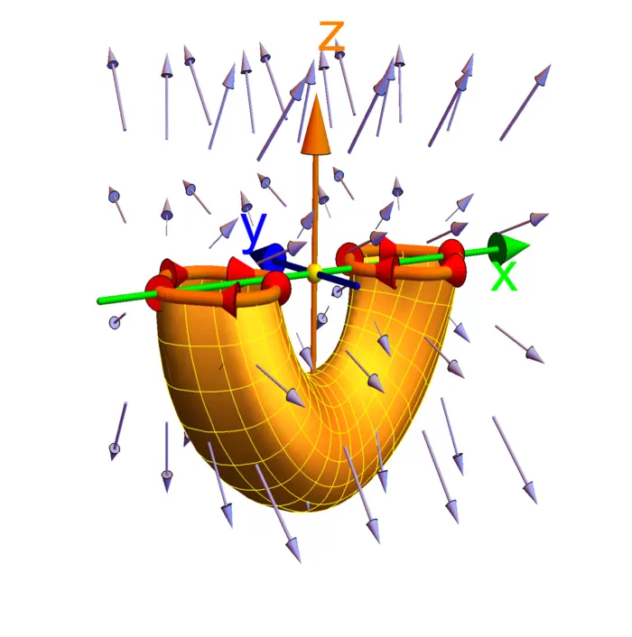 We see why the \(3\)-dimensional case looks confusing at first. We have three theorems which look very different. This type of confusion is common in science: we put things in the same bucket which actually are different: it is only in \(3\) dimensions that \(1\)-forms and \(2\)-forms can be identified. Actually, more is mixed up: not only are \(1\)-forms and \(2\)-forms identified, they are also written as vector fields which are \(T_{0}^{1}\) tensor fields. From the tensor calculus point of view, we identify the three spaces \[T_{0}^{1}(E)=E, \quad T_{1}^{0}(E)=\Lambda^{1}(E)=E^{*}, \quad \text{and} \quad \Lambda^{2}(E) \subset T_{2}^{0}.\] While we can still always identify vector fields with \(1\)-forms, this identification in a general non-flat space will depend on the metric. In \(\mathbb{R}^{4}\), the \(2\)-forms have dimension \(6\) and can no more be written as a vector. One still does. The electro-magnetic \(F\) is a \(2\)-form in \(\mathbb{R}^{4}\) which we write as a pair of two time-dependent vector fields, the electric field \(E\) and the magnetic field \(B\).