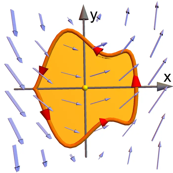 Green’s theorem tells that if \(G \subset \mathbb{R}^{2}\) is a region bound by a curve \(C\) having \(G\) to the left, then