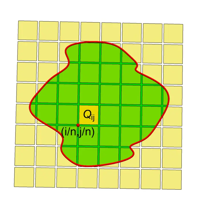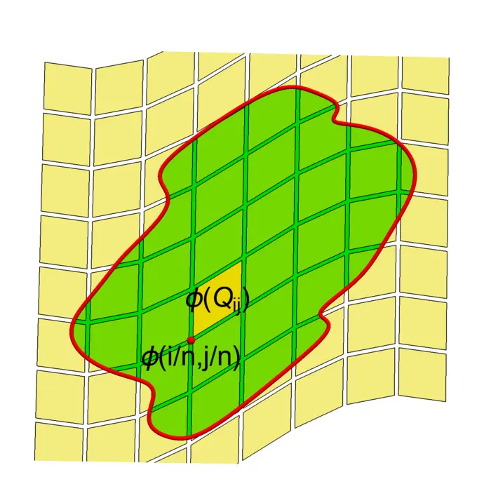 Proof. Cover \(S\) with cubes \(Q_{i j}\) as in the last lecture. Then \[\iint_{S} f(x, y) \,d x \,d y=\sum_{Q_{i j}} \iint_{Q_{i j} \cap S} f(x, y) \,d x \,d y \sim \sum_{i, j} f\Big(\frac{i}{n}, \frac{j}{n}\Big) \frac{1}{n^{2}}.\] The transformed squares \(\Phi(Q_{i j})\) are close to the parallelograms \(d \Phi(Q_{i j})\) which have area \(|d \Phi(i / n, j / n)| / n^{2}\). Now make a quadratic Taylor expansion \[\begin{aligned} \Phi(x, y)=\Phi(x_{0}, y_{0})+d \Phi(x_{0}, y_{0})(x-x_{0}, y-y_{0})+d^{2} \Phi(x_{0}, y_{0})(x-x_{0}, y-y_{0})^{2} / 2 \end{aligned}\] at \((x_{0}, y_{0})=(i / n, j / n)\), where \[\big|d^{2} \Phi(x_{0}, y_{0})(x-x_{0}, y-y_{0})^{2}\big| \leq M_{n}.\] Let \(F=\max _{(x, y) \in R}(|f(x, y)|)\). Applying in every direction, Taylor with remainder, we see \[\left|\int_{\Phi(Q_{i j} \cap S)} f(x, y) \,d x \,d y-f\Big(\Phi\big(\frac{i}{n}, \frac{j}{n}\big)\Big)\right|\, d \Phi\big(\frac{i}{n}, \frac{j}{n}\big)\,\Big|\frac{1}{n^{2}}\Big| \leq \frac{M_{n} F}{n^{2}}\] As the number of squares hitting \(R\) is bound by \(A n^{2}+4 L n\) where \(A\) is the area of \(R\) and \(L\) is the length of the boundary of \(R\), the sum of the non-linear errors is therefore bound by \((A n^{2}+4 L n) \,M_{n} F / n^{2}\) which goes to zero for \(n \rightarrow \infty\). ◻