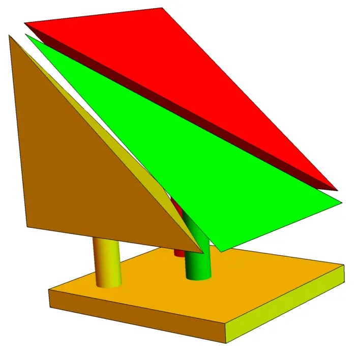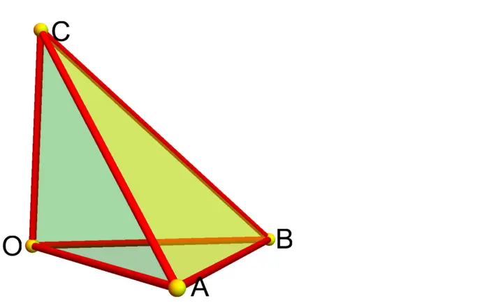 Exercise 1. The 3D Pythagoras theorem states that the square of the area of \(A B C\) is the sum of the squares of the areas of the triangles \(O A B\), \(O B C\) and \(O C A\) (which are each half of a rectangle). Use Figure (6.9) with \(A=(a, 0,0)\), \(B=(0, b, 0)\), \(C=(0,0, c)\) to verify this theorem. Use the cross product to get the areas.