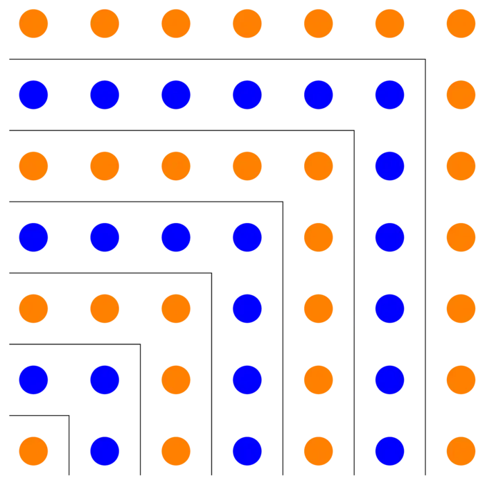 Exercise 4. Design a visual proof for the Faulhaber formula \[1^{3}+2^{3}+3^{3}+\cdots+n^{3}=(1+2+3+\cdots+n)^{2}\] which is also called the Nichomachus theorem.