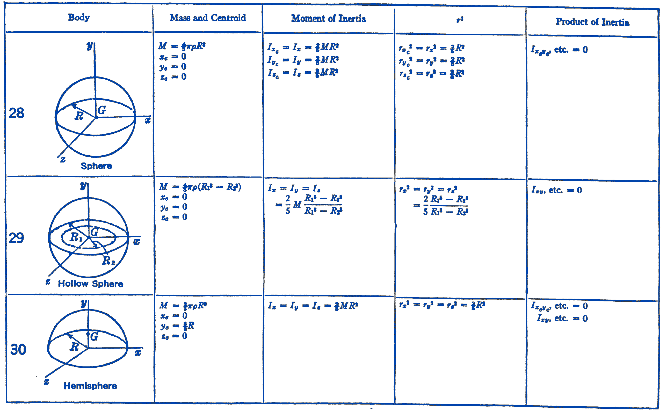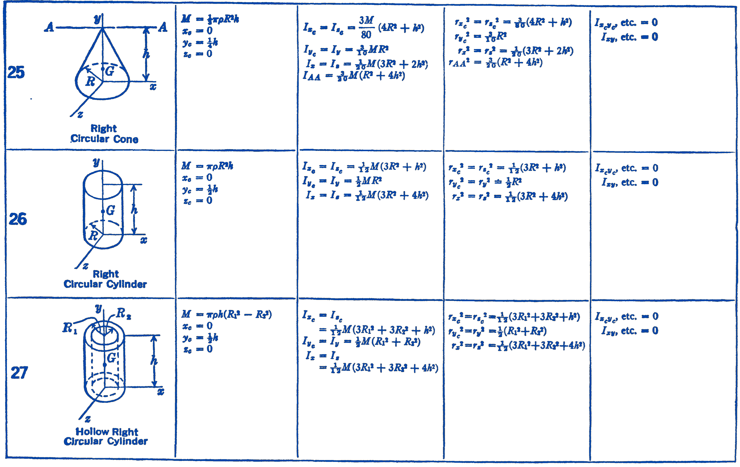 - \(I_{x_c}, I_{y_c}, I_{z_c}=\) Moment of inertia about an axis through the centroid parallel to the \(x y z\) axes shown.